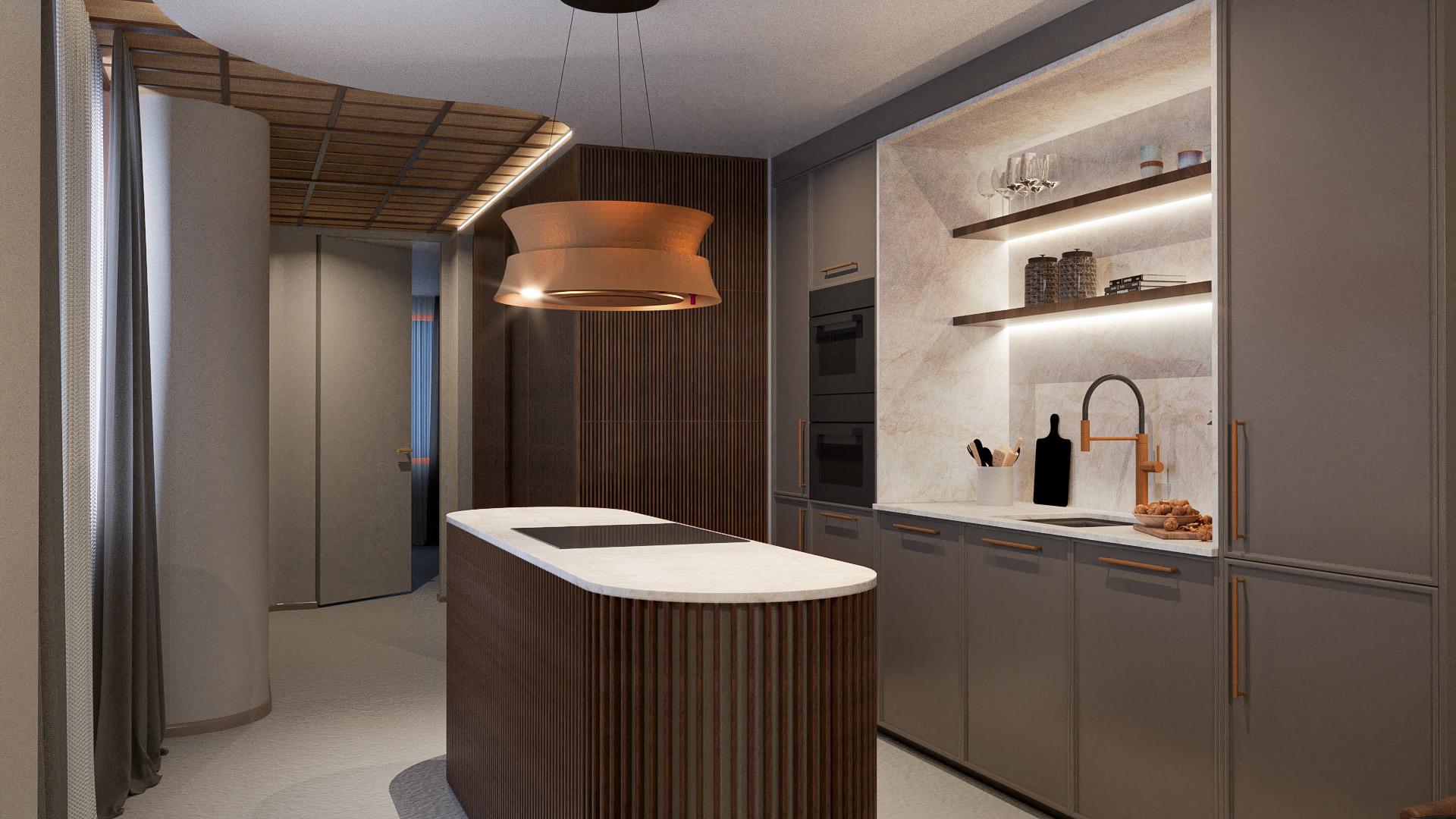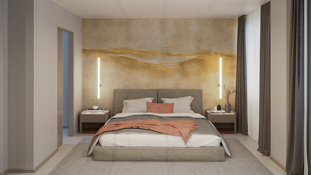 La madera estriada y los tonos neutros evocan la sobriedad japonesa, reforzada por líneas puras, composiciones limpias y proporciones equilibradas. La esencia mediterránea se refleja en el ambiente y en la cuidada materialidad táctil, donde cada textura invita al contacto y transmite una sensación de confort y naturalidad.